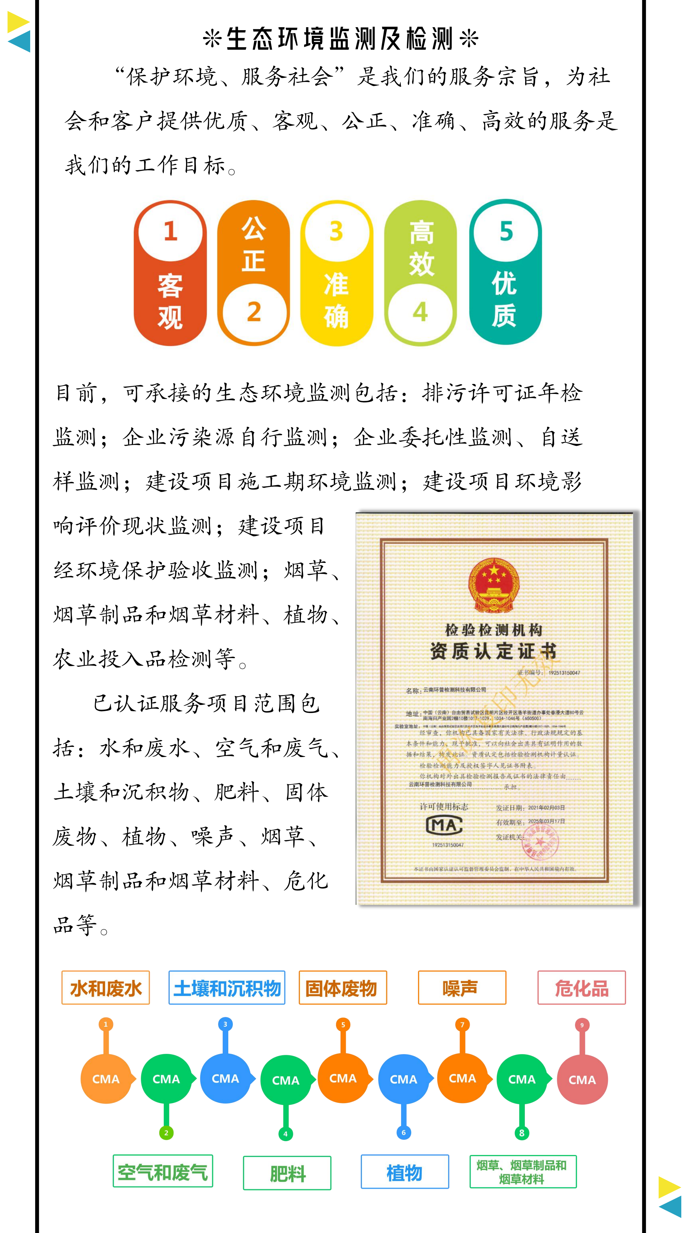 檢測范圍包括:排污許可證年檢監(jiān)測;企業(yè)污染源自行監(jiān)測;企業(yè)委托性監(jiān)測、自送樣監(jiān)測;建設(shè)項(xiàng)目施工期環(huán)境監(jiān)測;建設(shè)項(xiàng)目環(huán)境影響評價(jià)現(xiàn)狀監(jiān)測;建設(shè)項(xiàng)目經(jīng)環(huán)境保護(hù)驗(yàn)收監(jiān)測;煙草、煙草制品和煙草材料、植物、農(nóng)業(yè)投入品檢測等