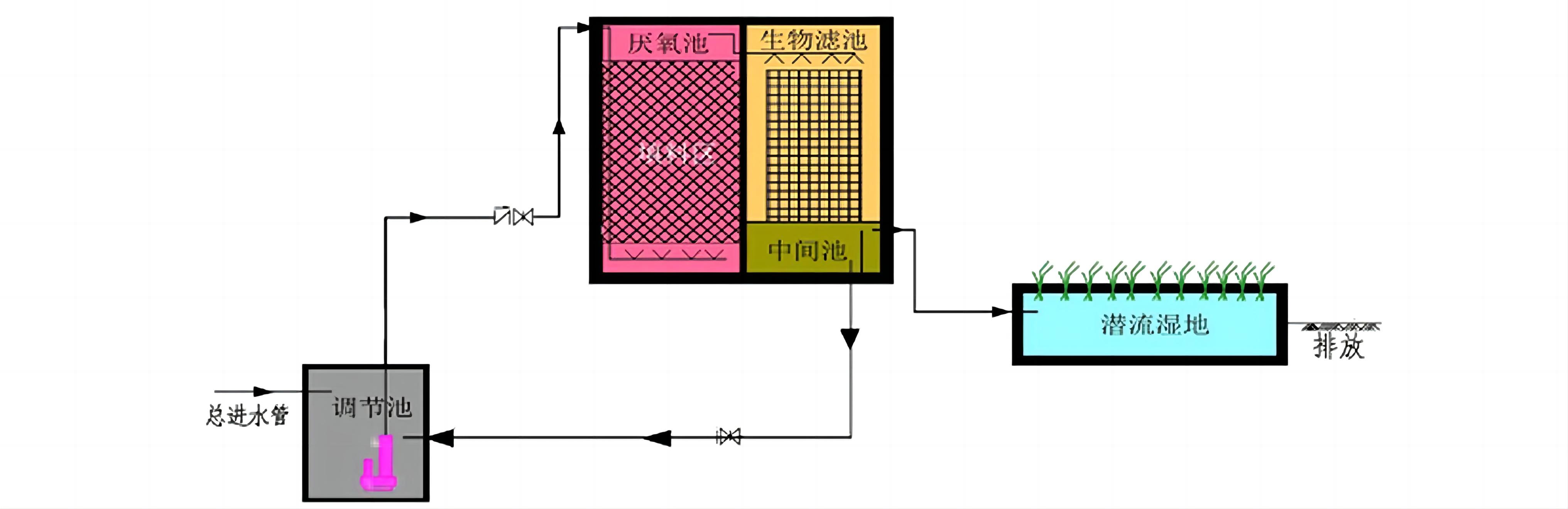 工藝原理∶模塊化分層生物滴濾池屬于生物膜法污水處理工藝范疇,主要由集水池、復(fù)合濾床、中間池、人工濕地等部分組成。通過(guò)特殊強(qiáng)化濾料進(jìn)行生物和生態(tài)處理實(shí)現(xiàn)污水達(dá)標(biāo)處理。