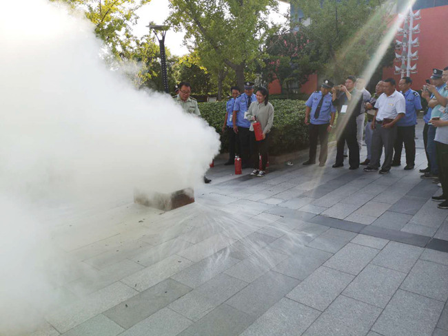 消防隊員現(xiàn)場講解滅火器使用原理,并組織物業(yè)人員、企業(yè)負責(zé)人現(xiàn)場操作。