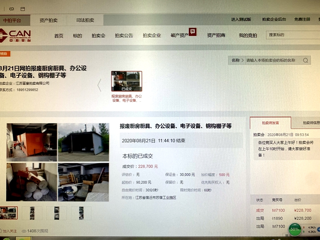 8月21日上午10時,城發(fā)公司報廢廚具、辦公設(shè)備、電子設(shè)備、鋼構(gòu)棚子等物資網(wǎng)上拍賣開始,7家競買人,經(jīng)過1小時44分10秒244次的緊張激烈競價,最終以228700元成交標(biāo)的,比評估價90200元高出138500元,溢價率153.55%。