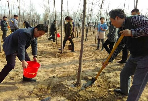 植樹過程中,參加植樹的人員個個熱情高漲、干勁十足,他們幾個人一組,扶直樹苗、揮鍬培土、踩實壓緊,不時還向身邊的園林綠化技術指導人員討教樹木種植、養(yǎng)護知識,整個勞動場面繁忙而有序。