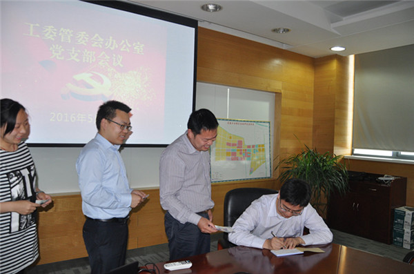 5月20日是園區(qū)工委管委會辦公室黨支部的黨員活動日?;顒赢斕?,黨支部全體黨員按照園區(qū)“兩學一做”學習教育部署開展集中學習。